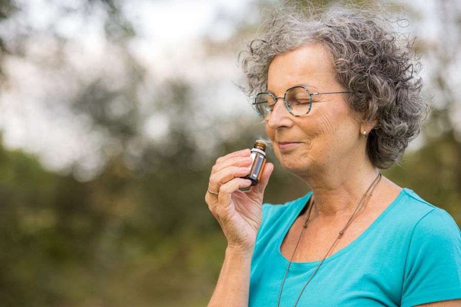 Wähle bewusst einen ätherischen Duft, der dich stärkt (z. B. Baumöle, Rosmarin oder eine klärende Mischung). Verreibe das Öl in deinen Handflächen, forme ein „Körbchen“ vor deiner Nase und nimm